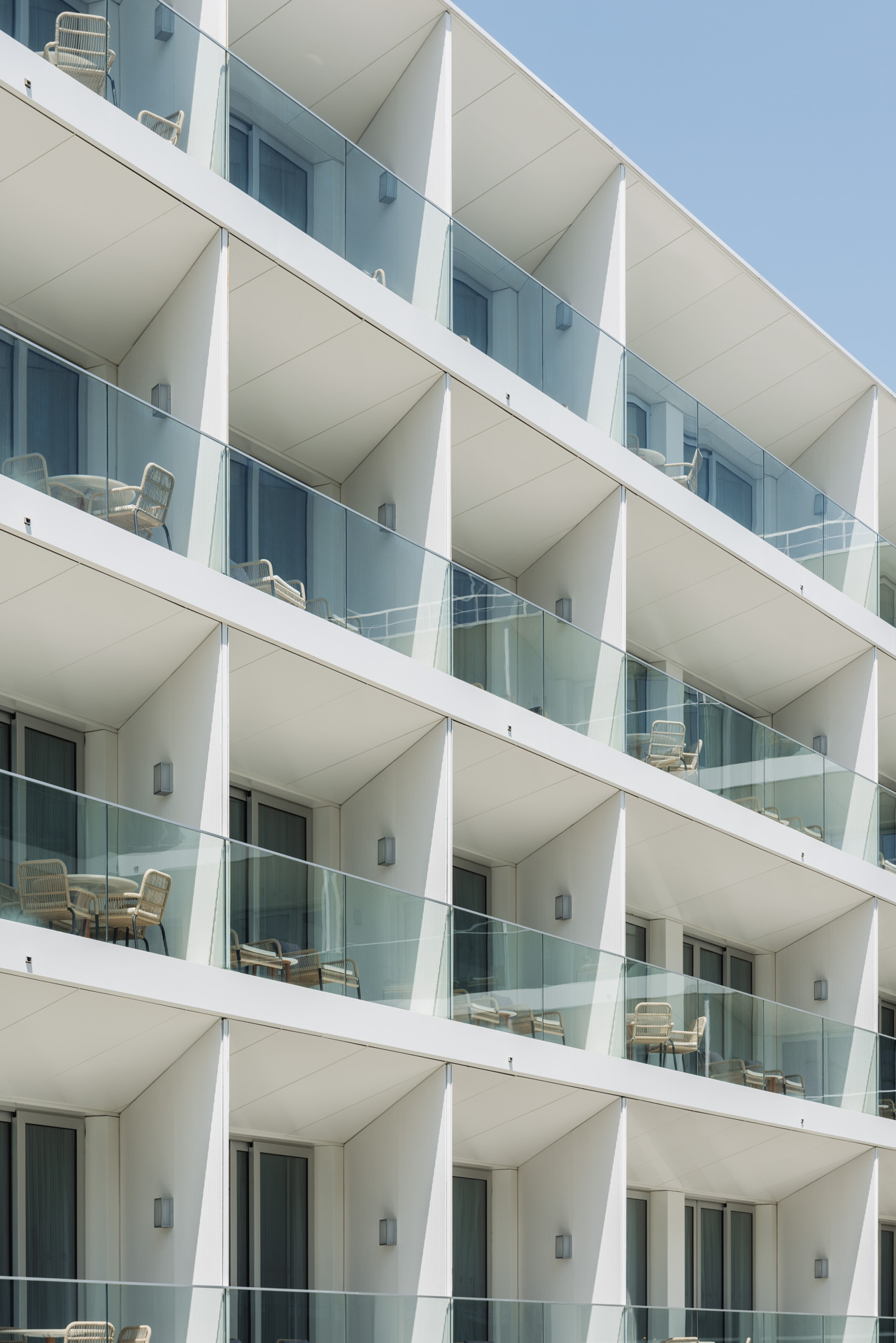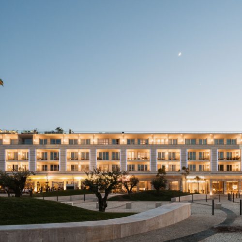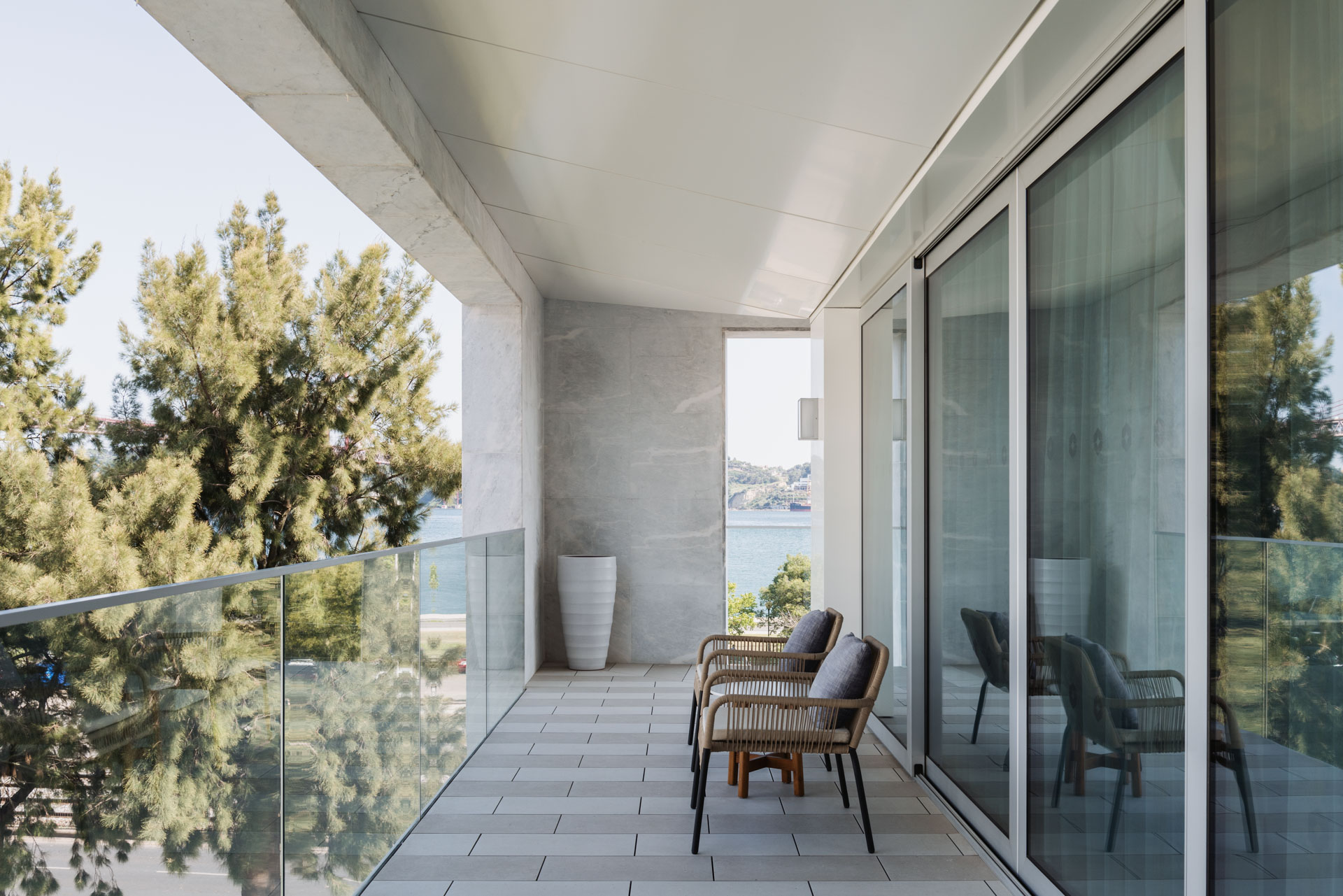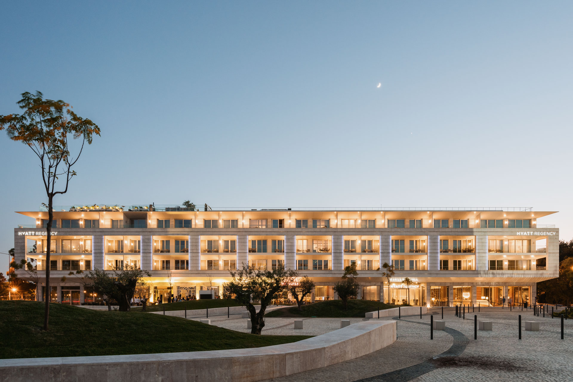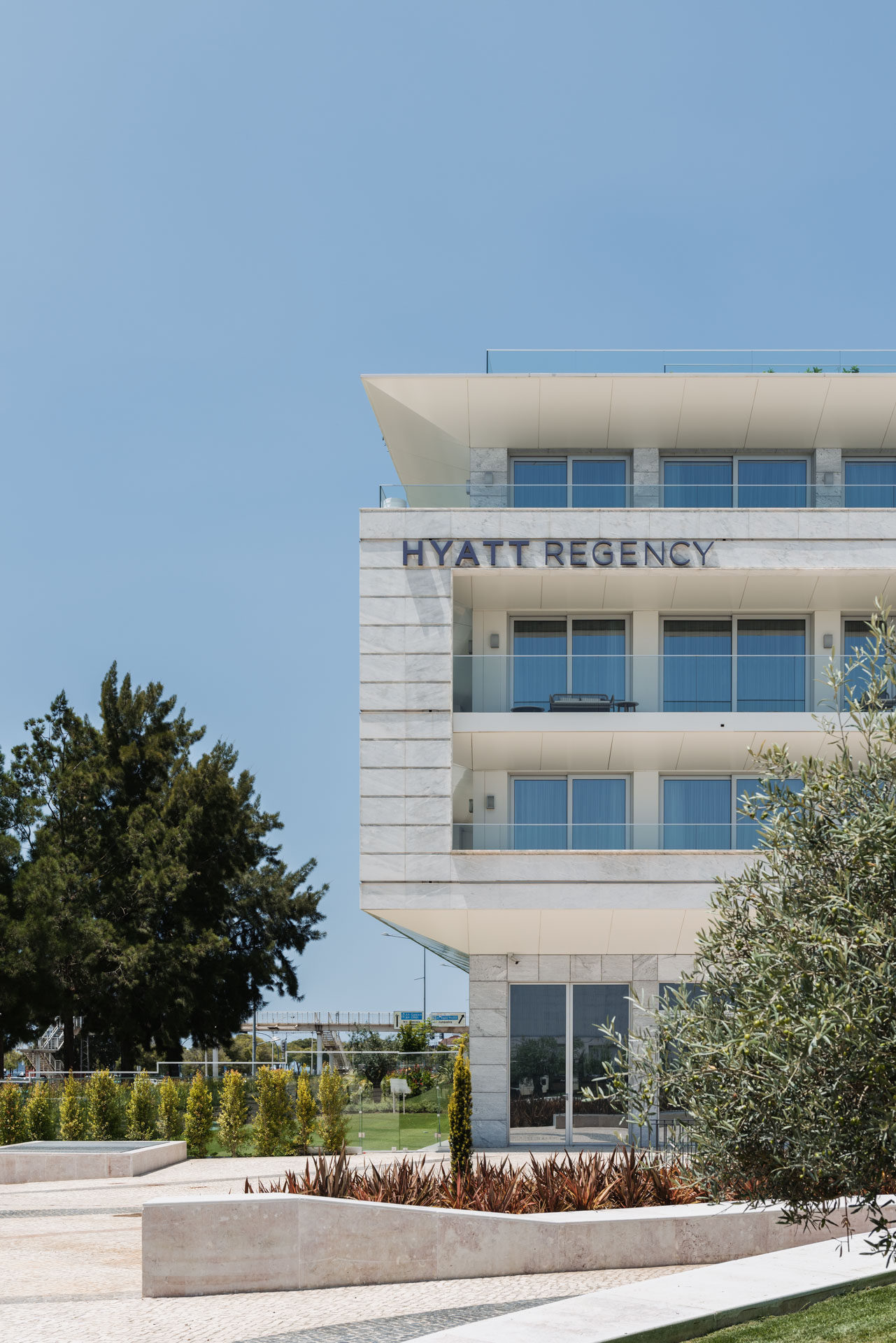 A five-star hotel from the Hyatt Regency chain, located opposite the River Tagus in the Belém/Junqueira area, it has a U-shaped layout completely open to the river, with a markedly horizontal design, contemporary lines and harmonious integration into the site. White marble stone façades incorporating the generous balconies of the flats.