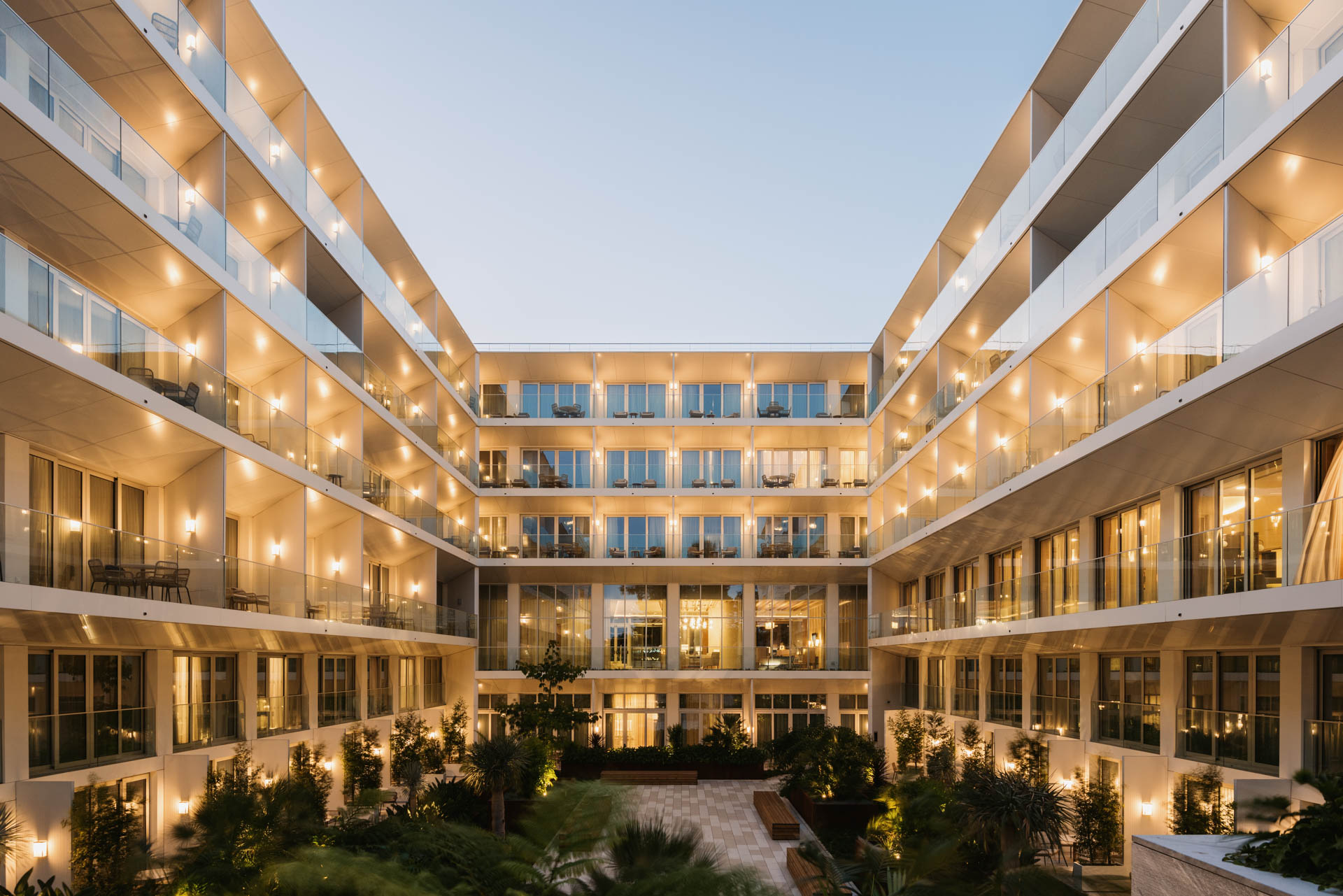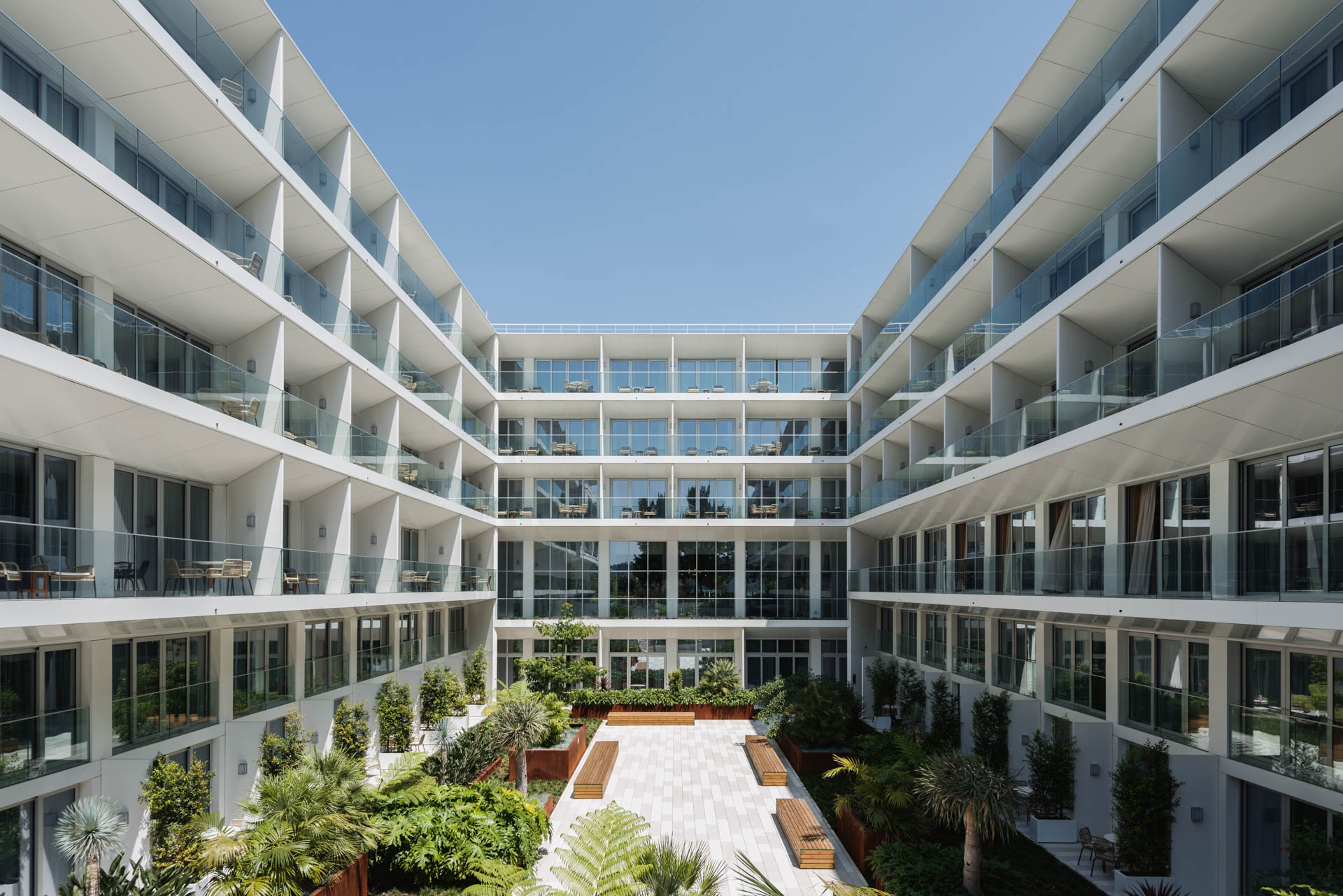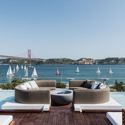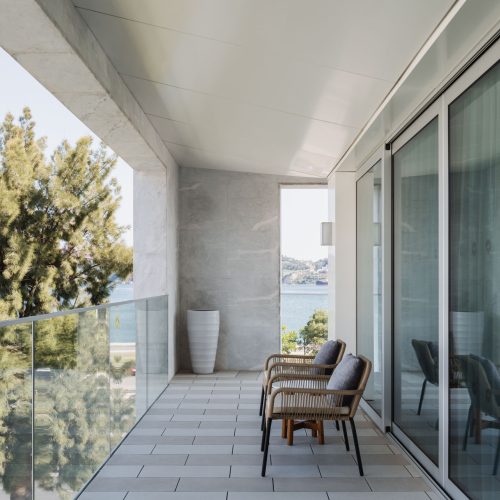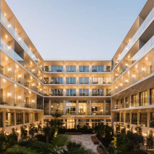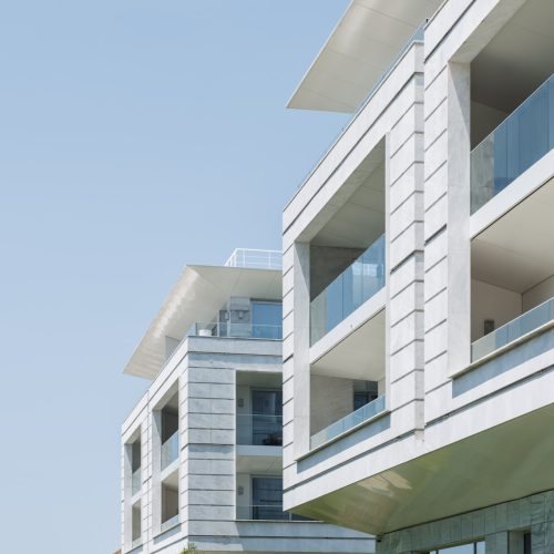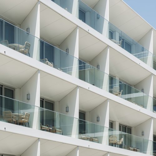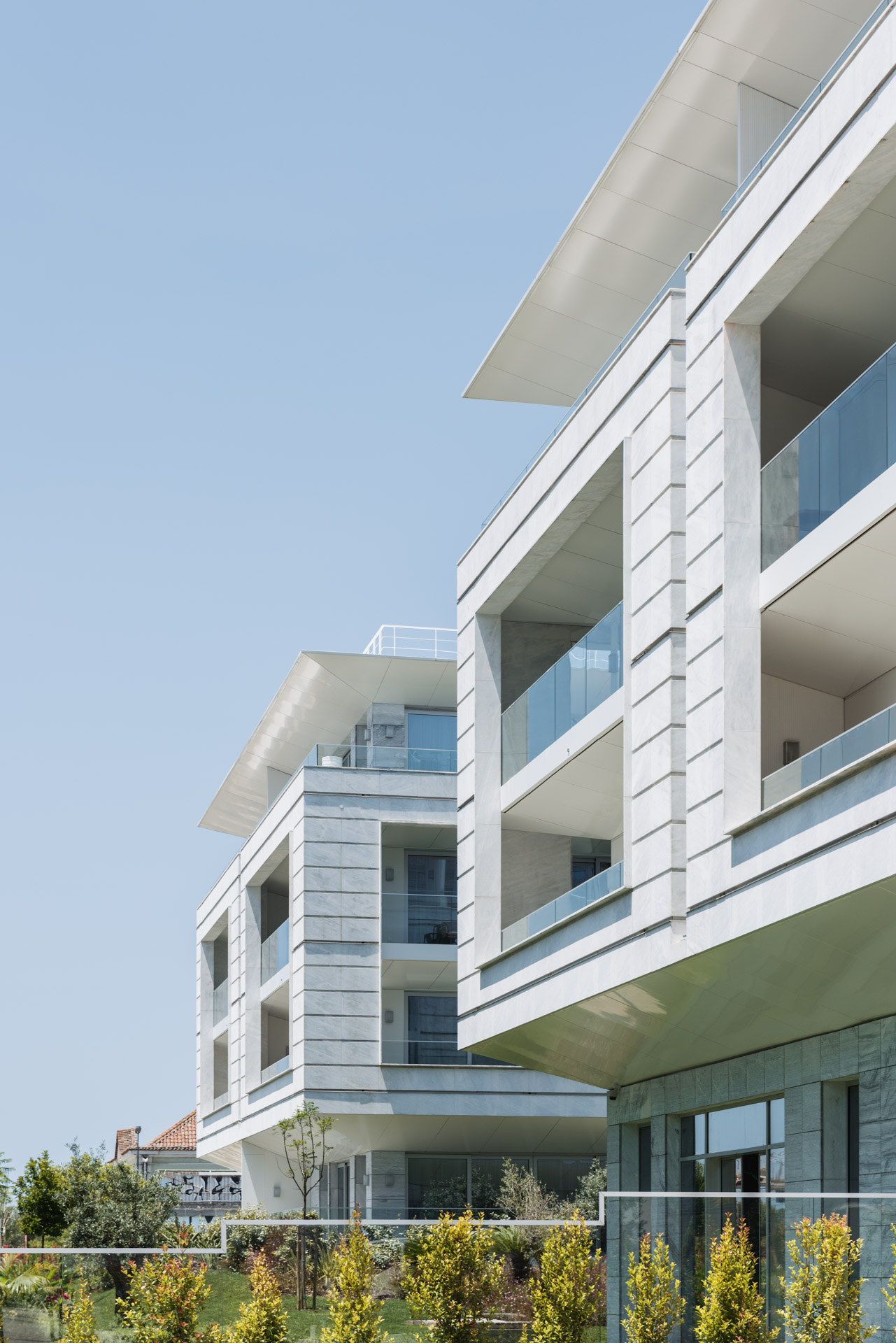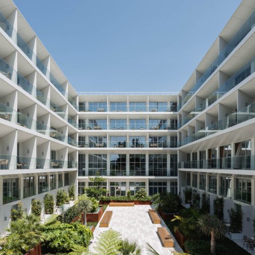 A five-star hotel from the Hyatt Regency chain, located opposite the River Tagus in the Belém/Junqueira area, it has a U-shaped layout completely open to the river, with a markedly horizontal design, contemporary lines and harmonious integration into the site. White marble stone façades incorporating the generous balconies of the flats.